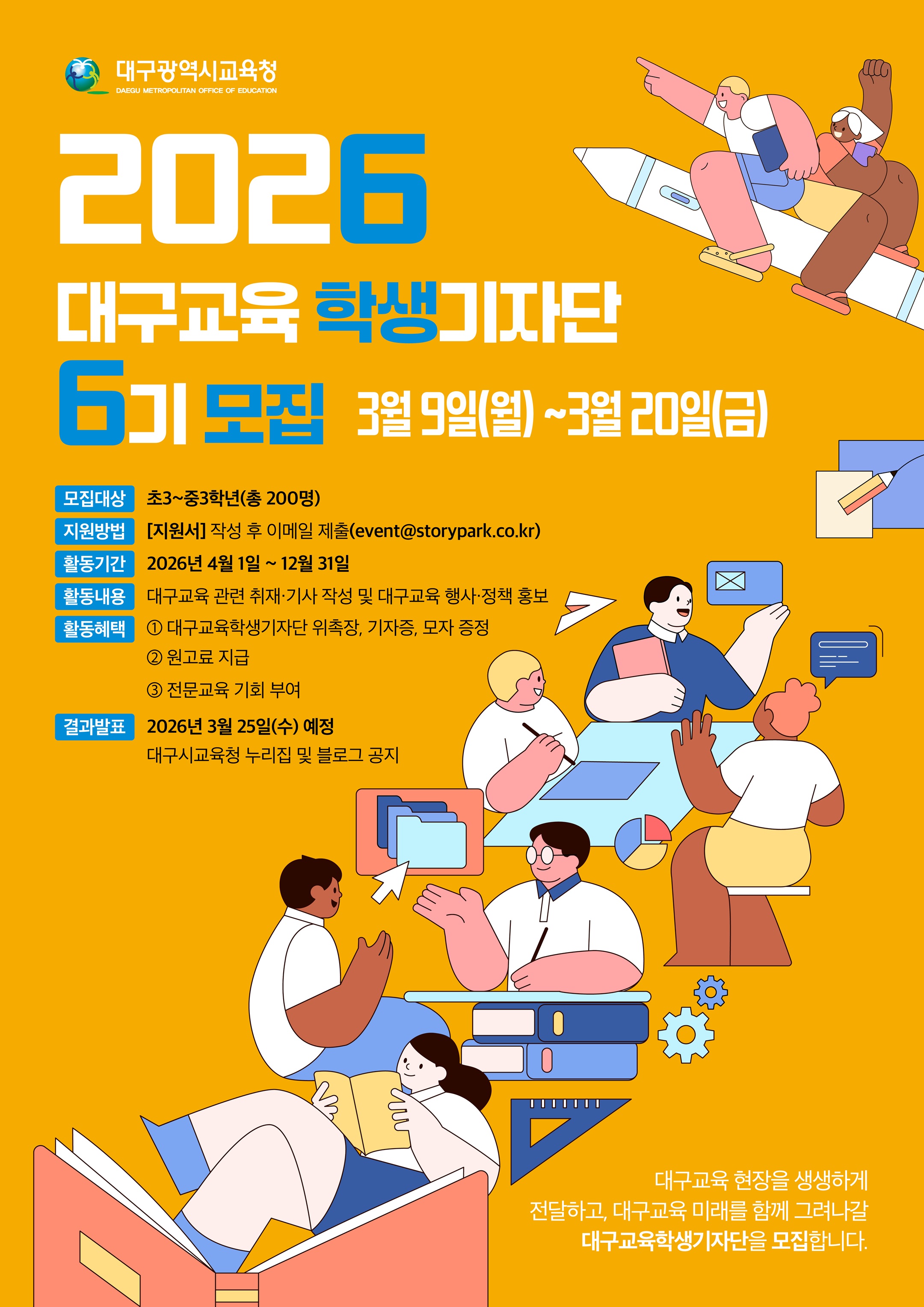 대구시교육청은 대구 교육정책과 현장의 소식을 생생하게 전달할 ‘2026년 대구교육기자단’을 모집합니다.