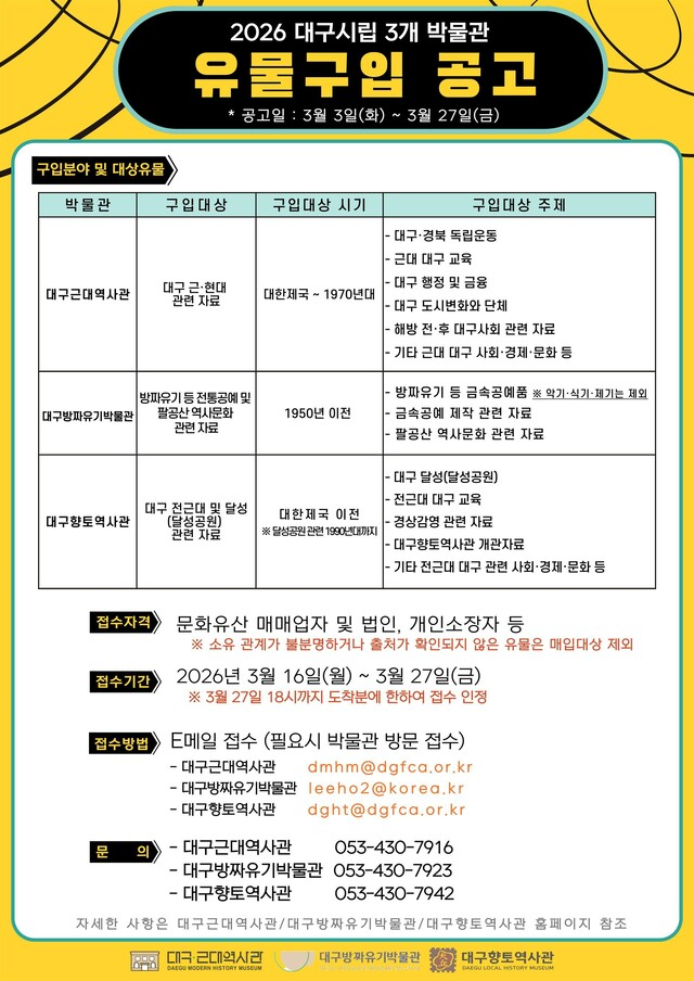 대구근대역사관과 대구방짜유기박물관, 그리고 대구향토역사관이 대구 지역사 및 전통공예 관련 유물을 구입합니다.