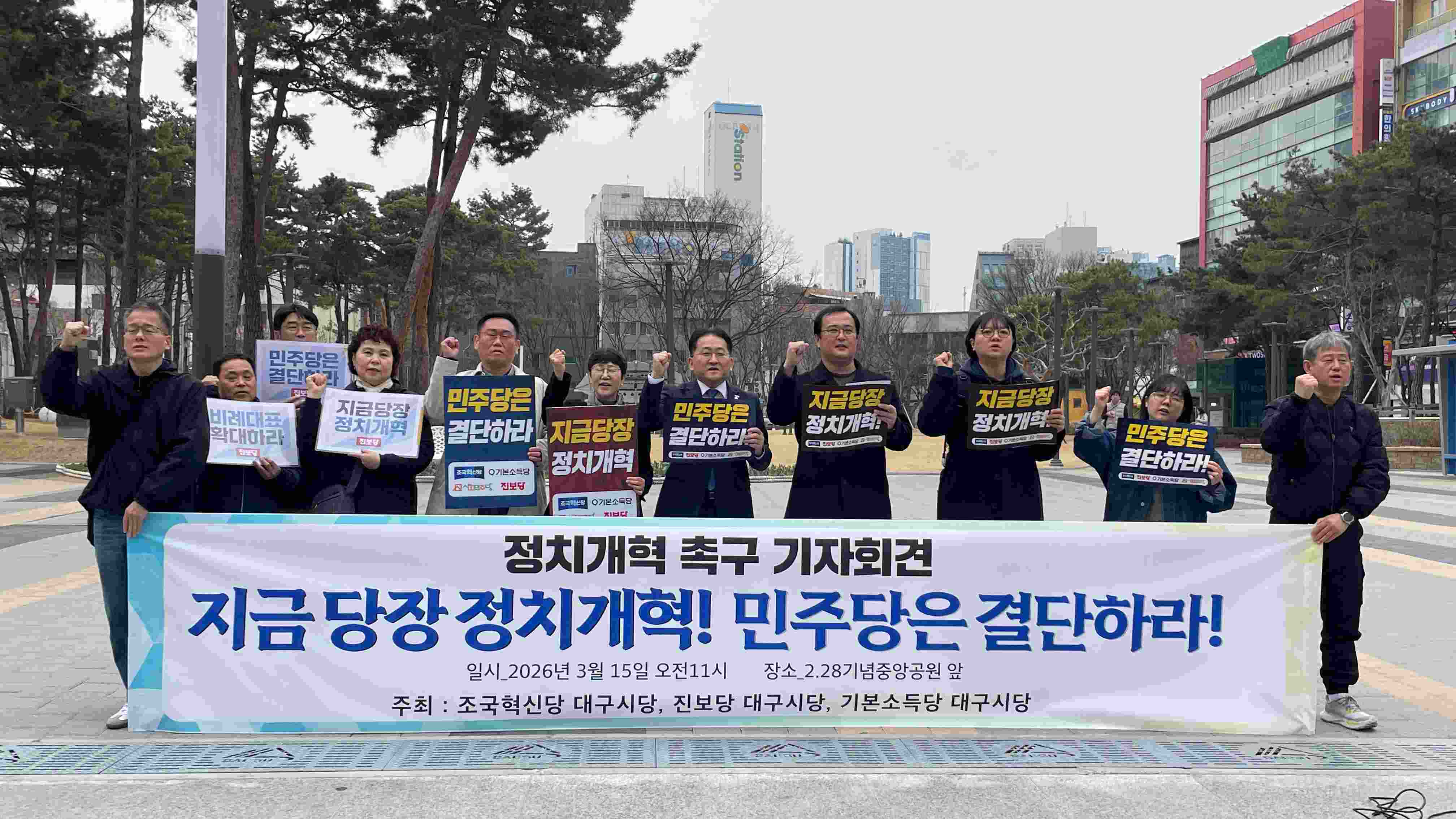 조국혁신당 대구시당, 진보당 대구시당, 기본소득당 대구시당은 3월 15일 2·28 기념 중앙공원에서 기자회견을 열고 "정치 개혁 없이 민주주의는 없다"라며 "2·28 정신으로 선거제도 개혁을 요구한다"라고 밝혔습니다.