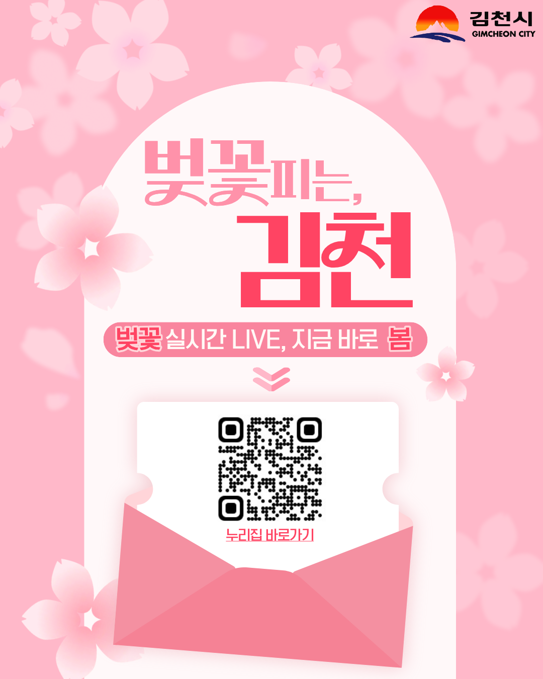 김천시는 3월 20일부터 4월 19일까지 실시간으로 벚꽃 개화 상황을 확인할 수 있는 '벚꽃 실시간 Live, 지금 바로 봄' 서비스를 김천시 대표 누리집을 통해 제공한다고 밝혔습니다.