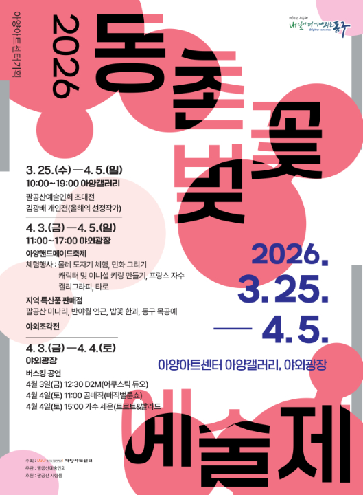 '2026 대구 동촌벚꽃예술제'가 3월 25일부터 4월 5일까지 대구 아양아트센터 아양갤러리와 야외 광장에서 열립니다.