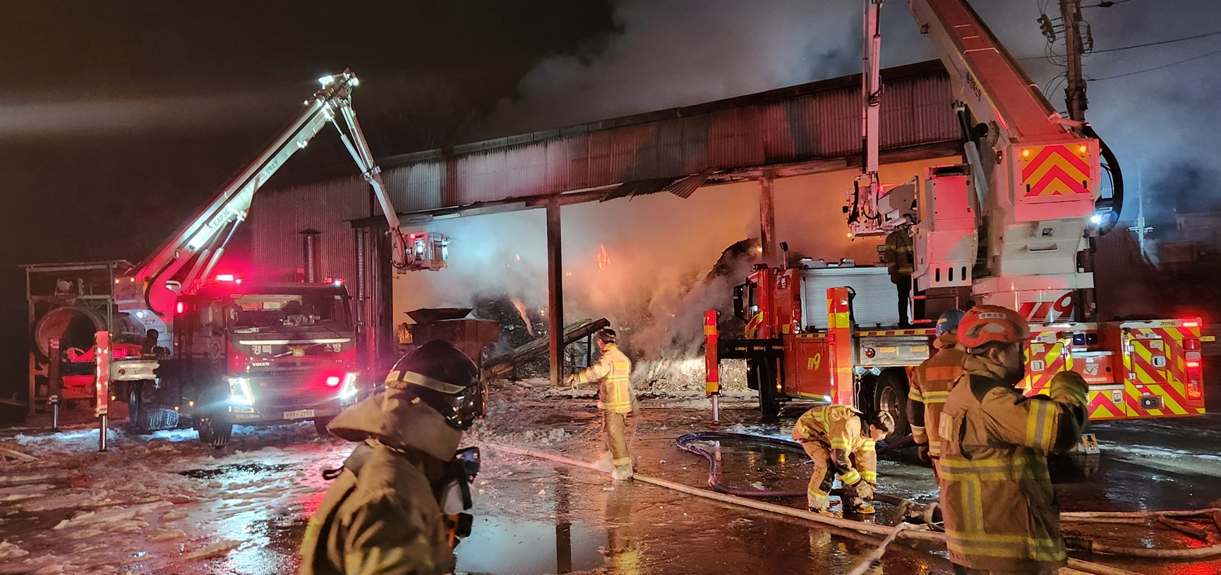 소방 당국은 내부에 합성수지 폐기물이 100톤 가량 있어 굴착기 등을 동원해 작업을 하고 있지만 불을 완전히 끄기에는 상당한 시간이 필요하다고 밝히고 있습니다.