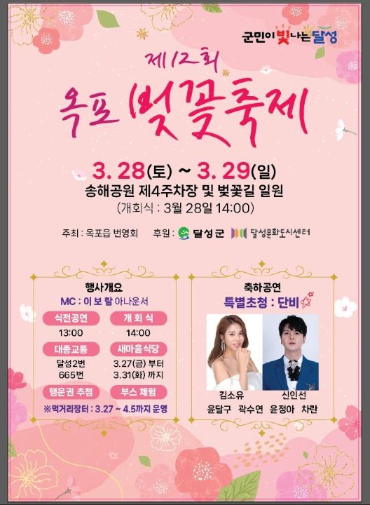 3월 28일과 29일, 대구 달성군 송해공원 일대에서 '제12회 옥포 벚꽃축제'가 열립니다.