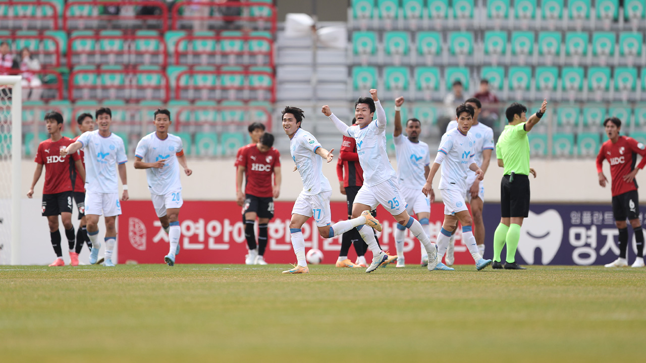 부산 구상민 골키퍼가 공을 쳐냈지만, 박스 밖에서 이 공을 잡은 김주공이 과감한 슈팅을 날렸고, 골문을 통과했습니다.