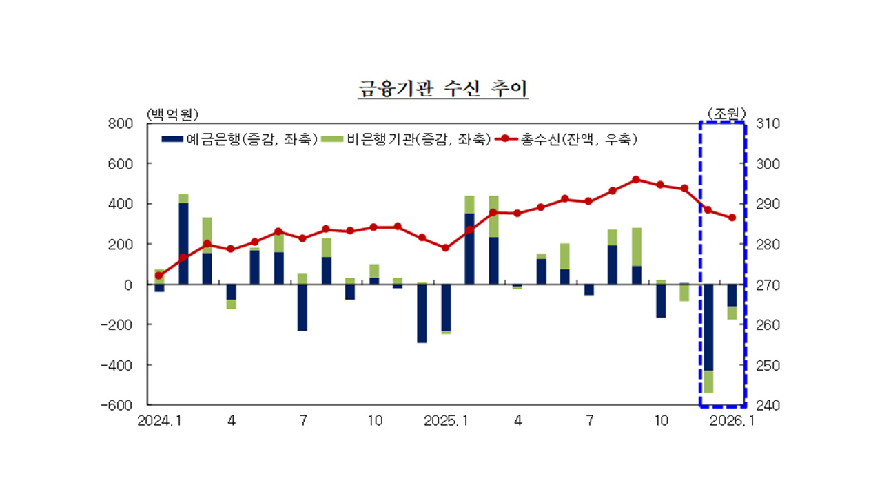 2025년 10월 이후 감소세가 이어졌지만, 예금은행과 비은행기관 모두 전월보다는 감소 폭이 축소됐습니다.