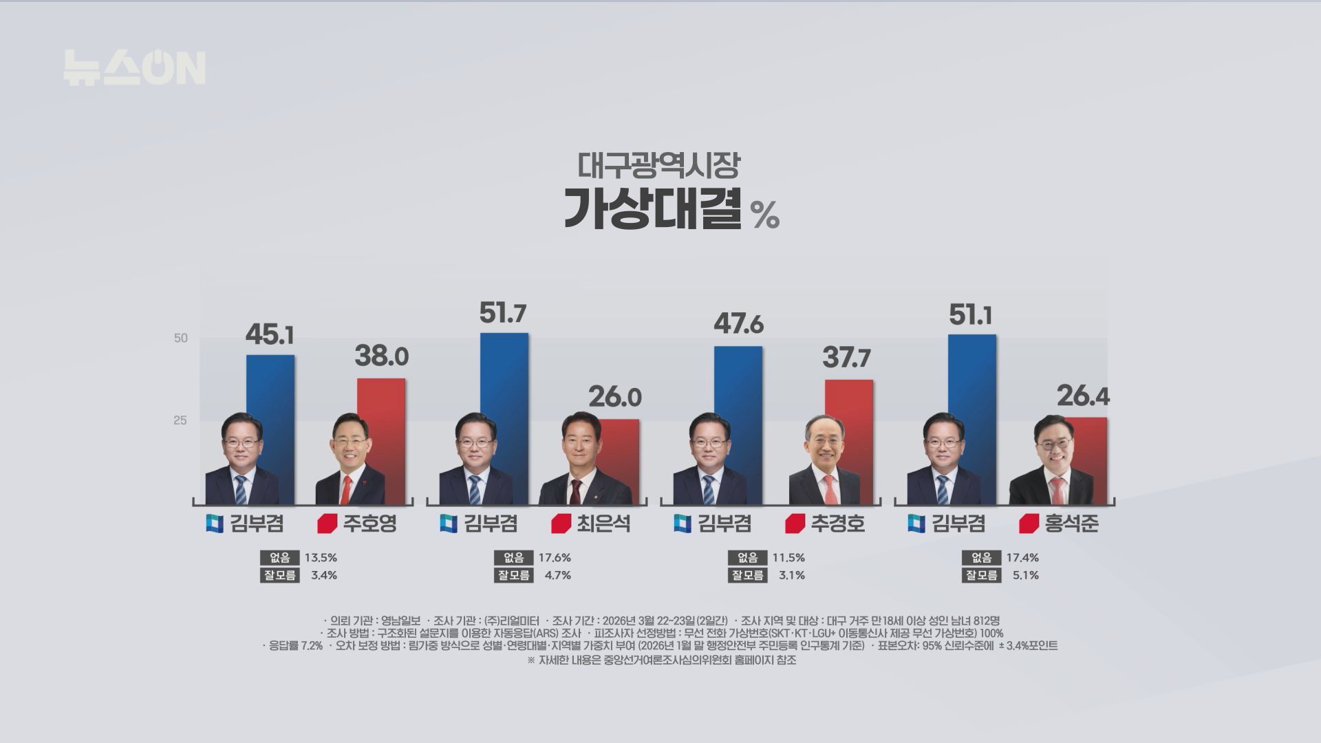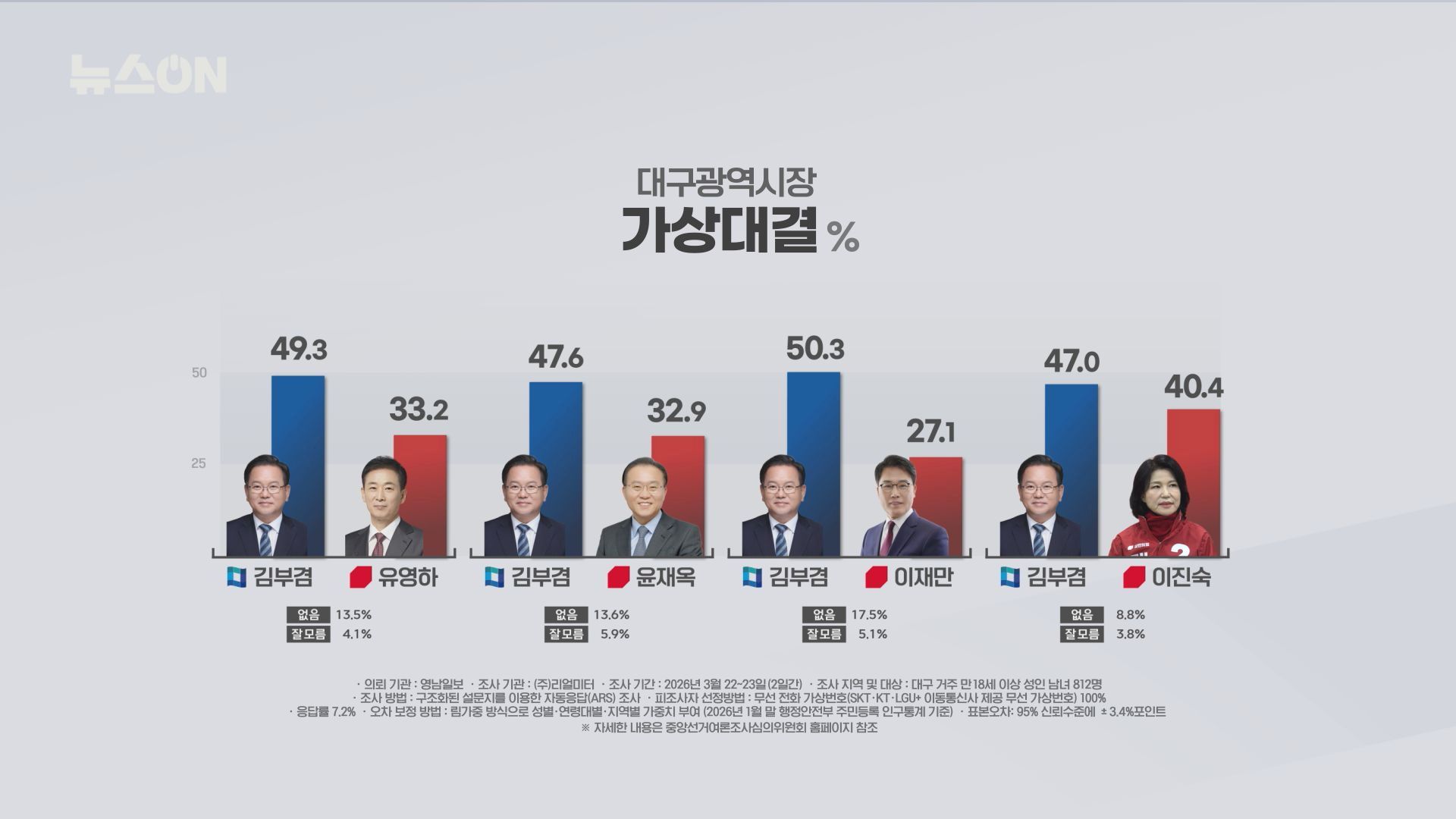 이 결과에 민주당 대구시당은 시장 선거 뿐만 아니라 기초, 광역 의원 선거 등에도 좋은 영향이 있을 수 있다는 분위기이고요. 공천 내홍을 겪고 있는 국민의힘은 대구도 뺏기나 하는 우려를 하고 있는데요. 다만, 이런 결과가 '보수 결집'을 유인할 것이라는 기대를 하고 있습니다. 다만, 일부에서는 다자대결 시 김 전 총리의 지지도보다 다른 국민의힘 예비후보들의 지지도 총합이 더 높다면서, 비관적으로 볼 필요는 없다는 분석도 있는데요.