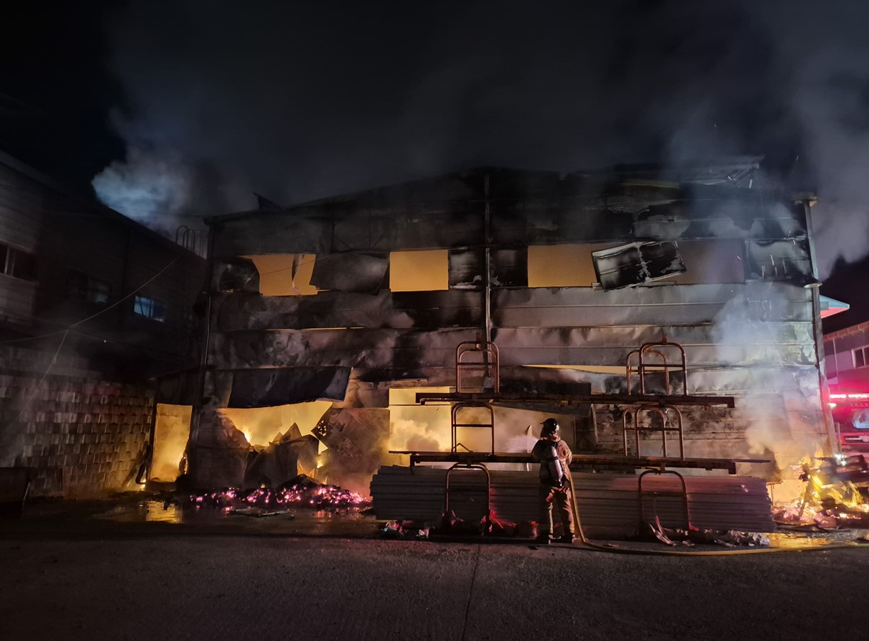 이 불로 공장 건물 1동 480㎡와 기계 2대, 지게차 등을 태워 소방서 추산 2억 3,800만 원의 재산 피해가 났습니다.