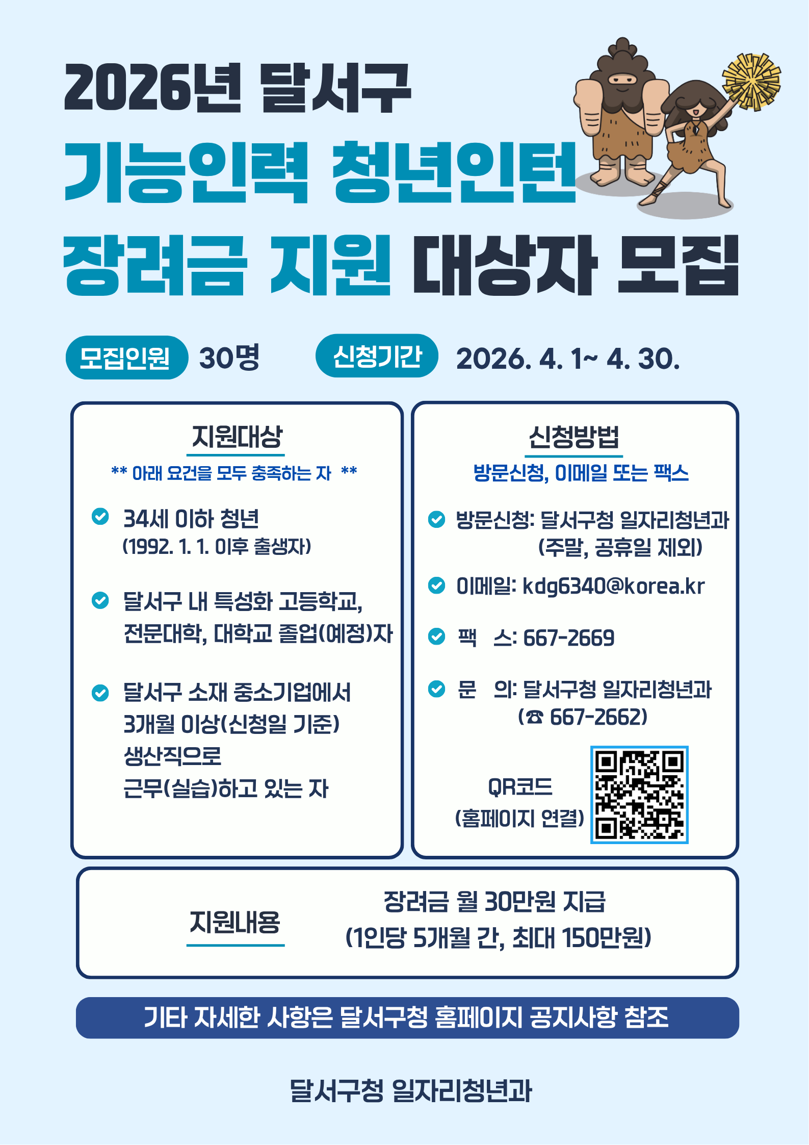 신청은 4월 30일까지 달서구 일자리청년과에 방문하거나 팩스, 이메일로 접수하면 됩니다.