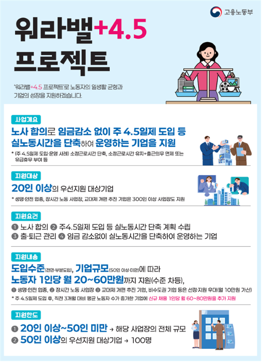 근로자 20인 이상의 우선지원대상기업 가운데 노사 합의를 통해 임금 감소 없이 주4.5일제 도입 등 실제 노동시간을 줄이는 기업에게 1년 동안 노동자 1명당 월 20만 원에서 60만 원까지 지원합니다.
