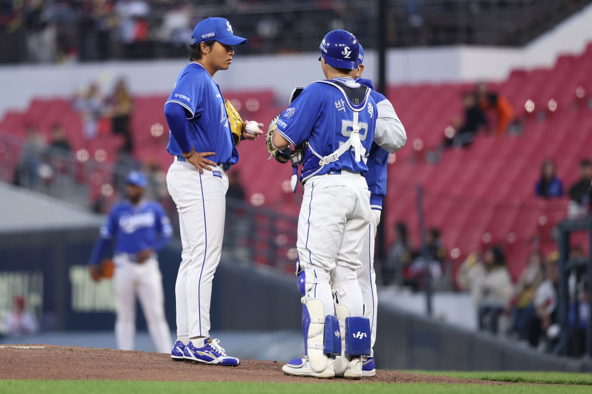 1회 초 삼성이 먼저 1점을 뽑았지만, 1회 말 2아웃을 잡은 이승현은 연속 볼넷에 연속 안타까지 허용하며 1-2 역전을 허용합니다.