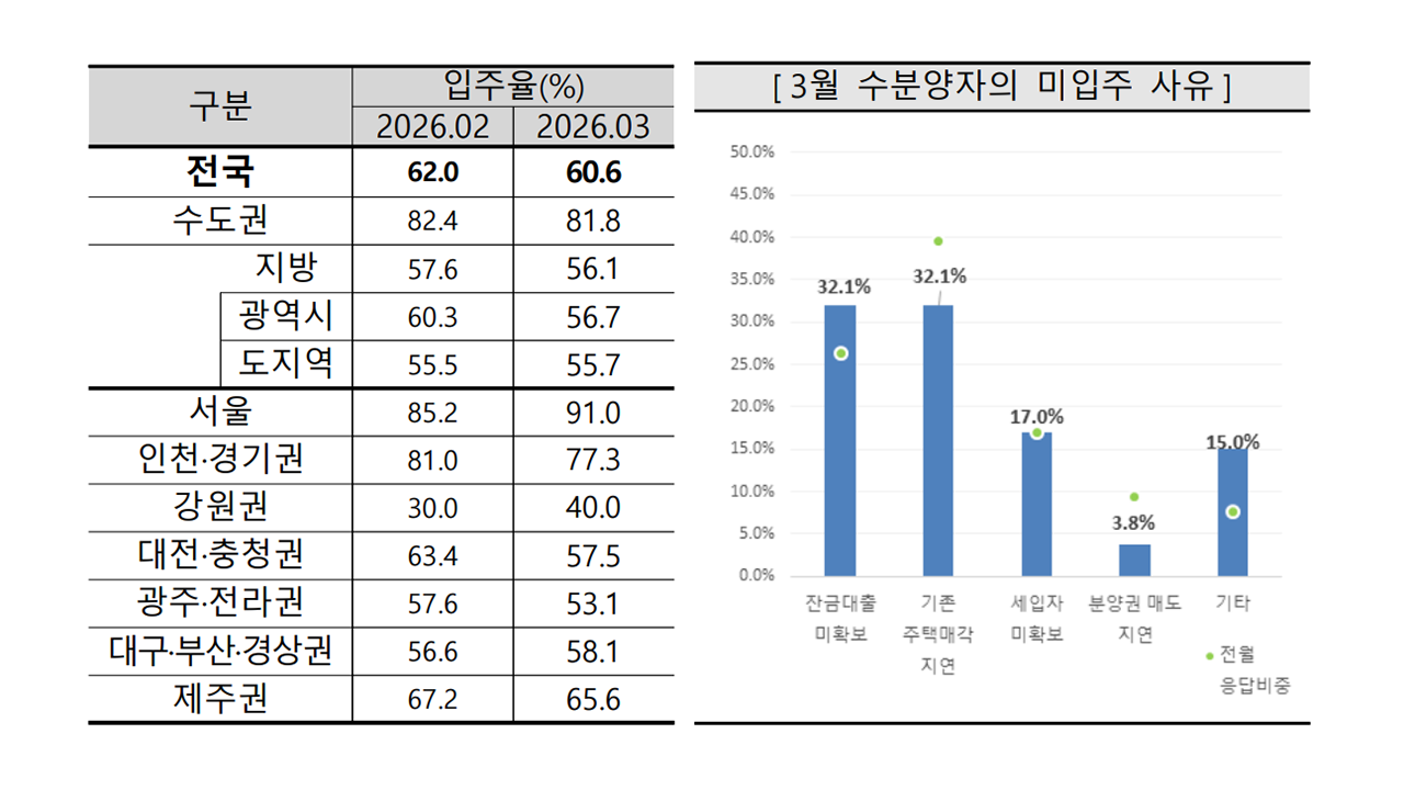 2026년 3월 전국 아파트 입주율은 60.6%로 2월보다 1.4% 포인트 하락했습니다.