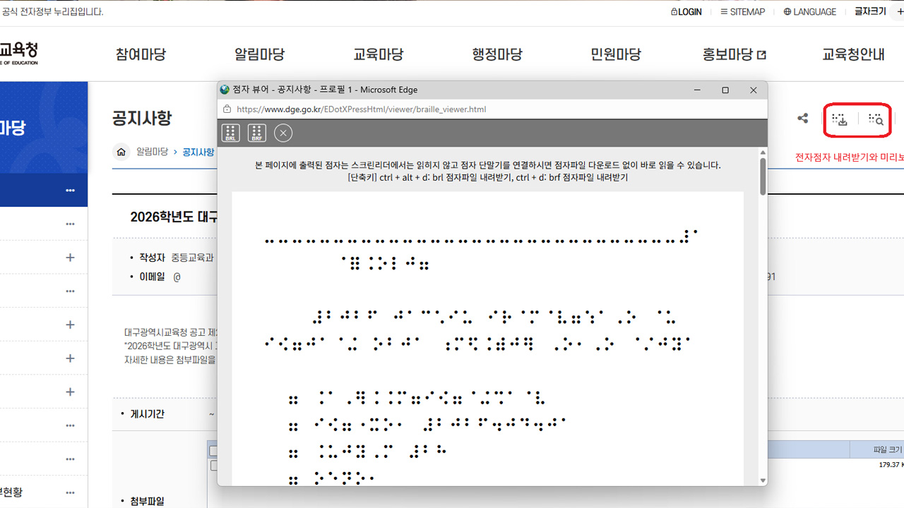 이를 통해 이용자는 별도의 변환 프로그램 없이도 게시글 우측 상단의 ‘점자 아이콘’을 클릭해 점역된 자료를 즉시 내려받을 수 있습니다.