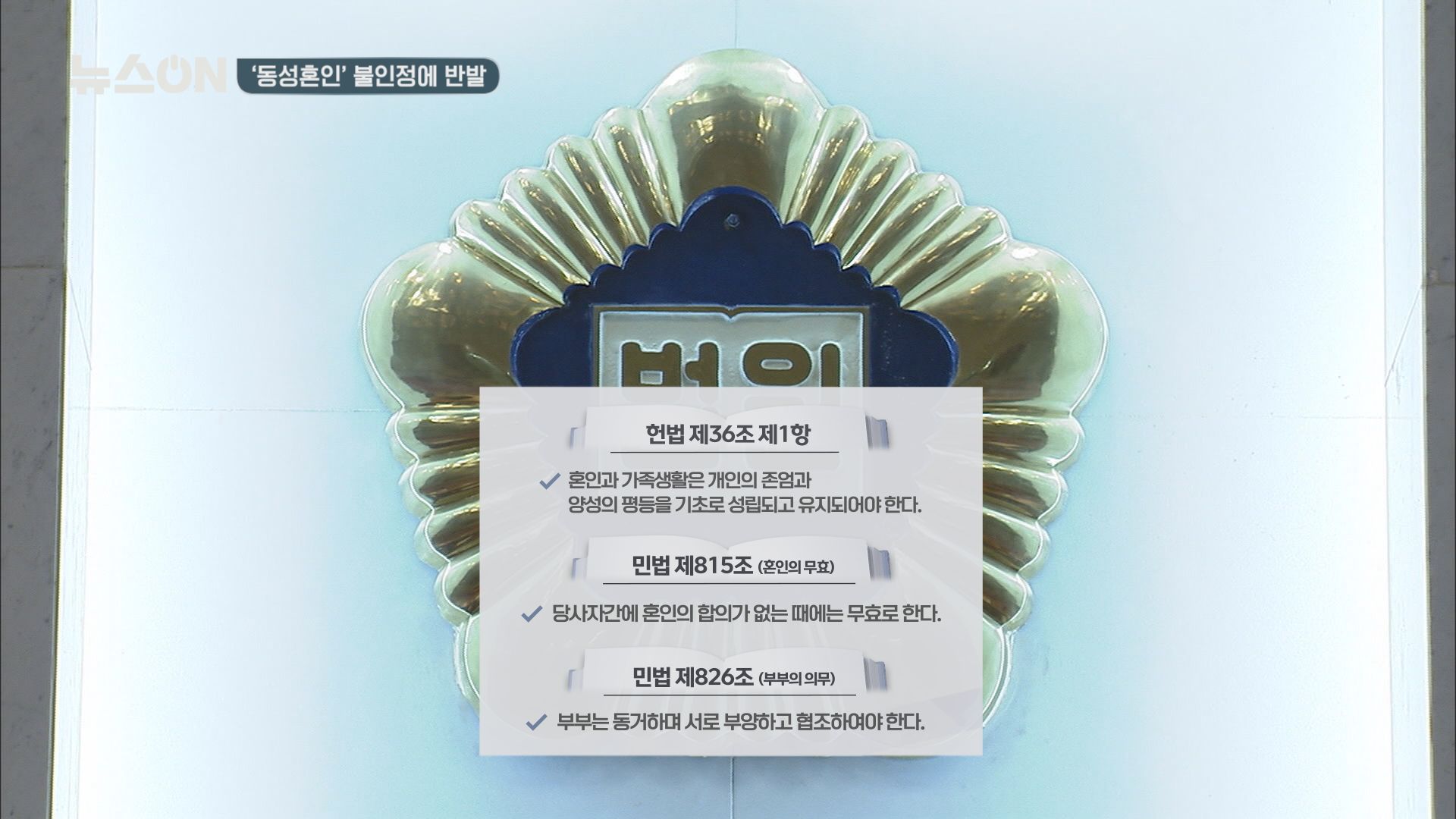 헌법 36조 제1항은 혼인과 가족생활은 개인의 존엄과 양성의 평등을 기초로 성립되고 유지되어야 한다고 규정하고 있고요. 민법 815조 혼인의 무효에서 당사자 간에 혼인의 합의가 없는 대는 무효로 한다, 826조 부부의 의무에서 부부는 동거하며 서로 부양하고 협조하여야 한다고 돼 있는데요.