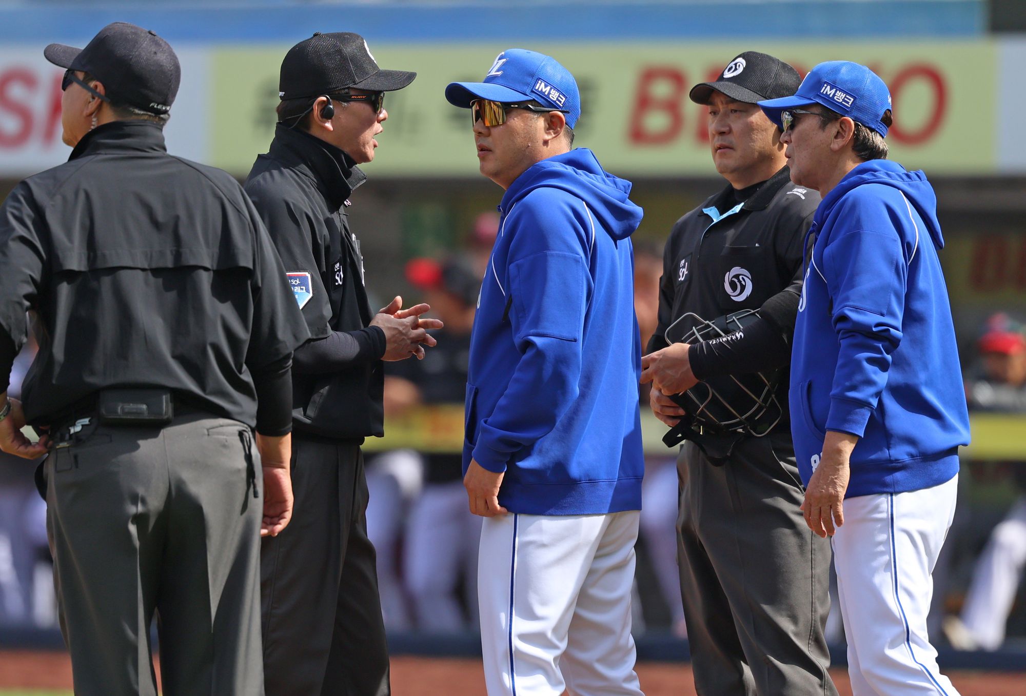 오지환의 헬멧에 스친 빠른 공으로 오러클린이 갑자기 '헤드샷 퇴장'을 당한 삼성은 급히 마운드를 이승민에게 넘겼고, 첫 타자 천성호가 안타를 뽑아내며 실점 위기가 커졌지만, 홍창기의 강한 땅볼을 이승민이 직접 병살로 연결하며 위기 탈출에 성공합니다.