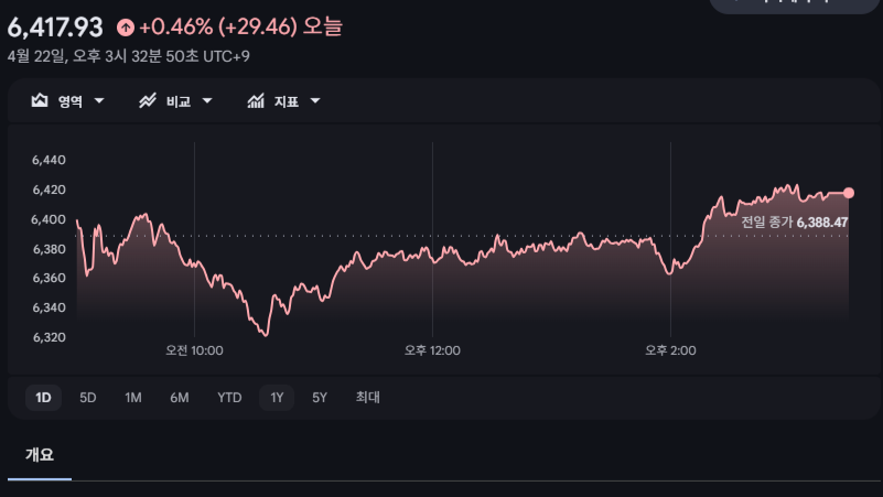 4월 22일 코스피는 전날보다 0.46%, 29.46포인트 상승한 6,417.93에 장을 마치며 종가 기준 최고치를 하루 만에 갈아치웠습니다.
