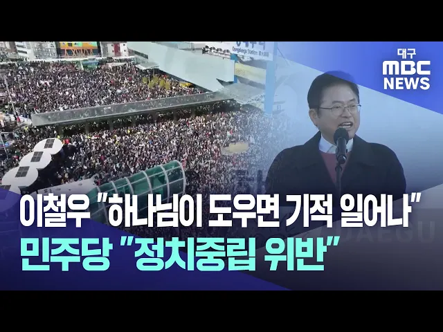 ◀앵커▶지난 주말 동대구역에서 열린 기독교 단체의 윤석열 대통령 탄핵 반대 집회에 이철우 경북도지사와 박성만 도의회 의장이 나란히 참석했습니다.특히, 이철우 지사는 국민의힘 소속 국회의원 등을 대표해 단상에 올라 마이크를 잡았는데요,이에 대해 민주당은 이 지사가 공무원의 정치 중립 의무를 위반했다고 반발하...