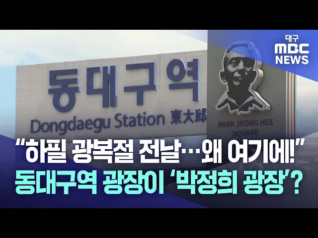 ◀앵커▶동대구역 앞 시민 공간의 이름이 '박정희 광장'으로 불리게 됐습니다.대구시는 광복절 하루 전날인 8월 14일 제막식을 가졌는데요.시민 단체들은 광장에 "독립군을 탄압한 독재자의 이름을 달았다"며 반발했습니다.손은민 기자입니다.◀기자▶동대구역 앞에 5m 기둥이 우뚝 섰습니다.대구를 대표하는 관문 앞 시민들 공...