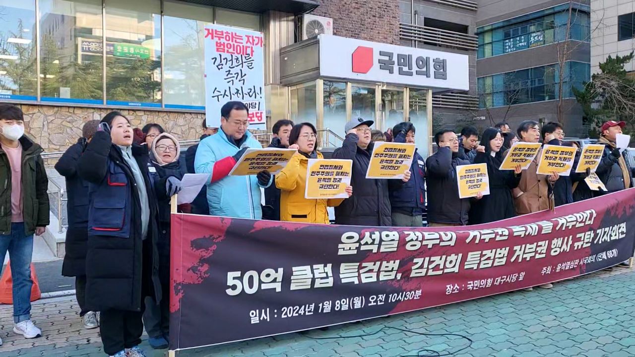 대구 지역 68개 시민·정치 단체로 구성된 윤석열 심판 대구시국회의가 1월 8일 국민의힘 대구시당 앞에서 김건희 여사 특검법과 대장동 50억 클럽 특검법에 거부권을 행사한 윤석열 대통령을 규탄하는 긴급 기자회견을 열었습니다.이들은 "양곡관리법, 간호법, 노란봉투법에 이은 네 번째 거부권 행사"라며 "오랜 시간 국민...