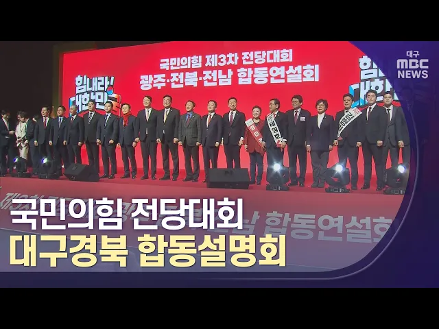 ◀앵커▶국민의힘 새 지도부를 뽑는 전당대회가 8일 앞으로 다가온 가운데 보수의 텃밭인 대구·경북에서 합동 설명회가 열렸습니다. 국민의힘 당세가 가장 강한 TK는 이번 전당대회의 최대 승부처 중 하나여서 관심이 집중됐습니다.설명회에서 후보들은 천하람 후보를 제외하고는 지역 현안을 언급하기 보다는 후보 간 정치 ...