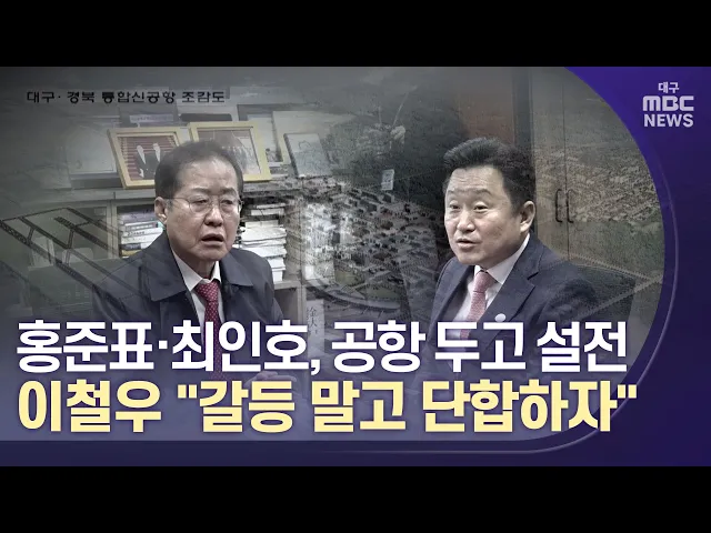 ◀앵커▶대구·경북 통합 신공항 특별법 통과를 두고 홍준표 대구시장과 국토교통위 교통법안소위원장인 더불어민주당 최인호 의원이 설전을 벌이고 있습니다.1월 초 최 의원이 법조문을 수정하지 않으면 통과시키지 않겠다는 말이 불씨가 됐는데요.급기야 이철우 경북도지사가 다투지 말자며 중재에 나섰습니다.취재기자와 자...