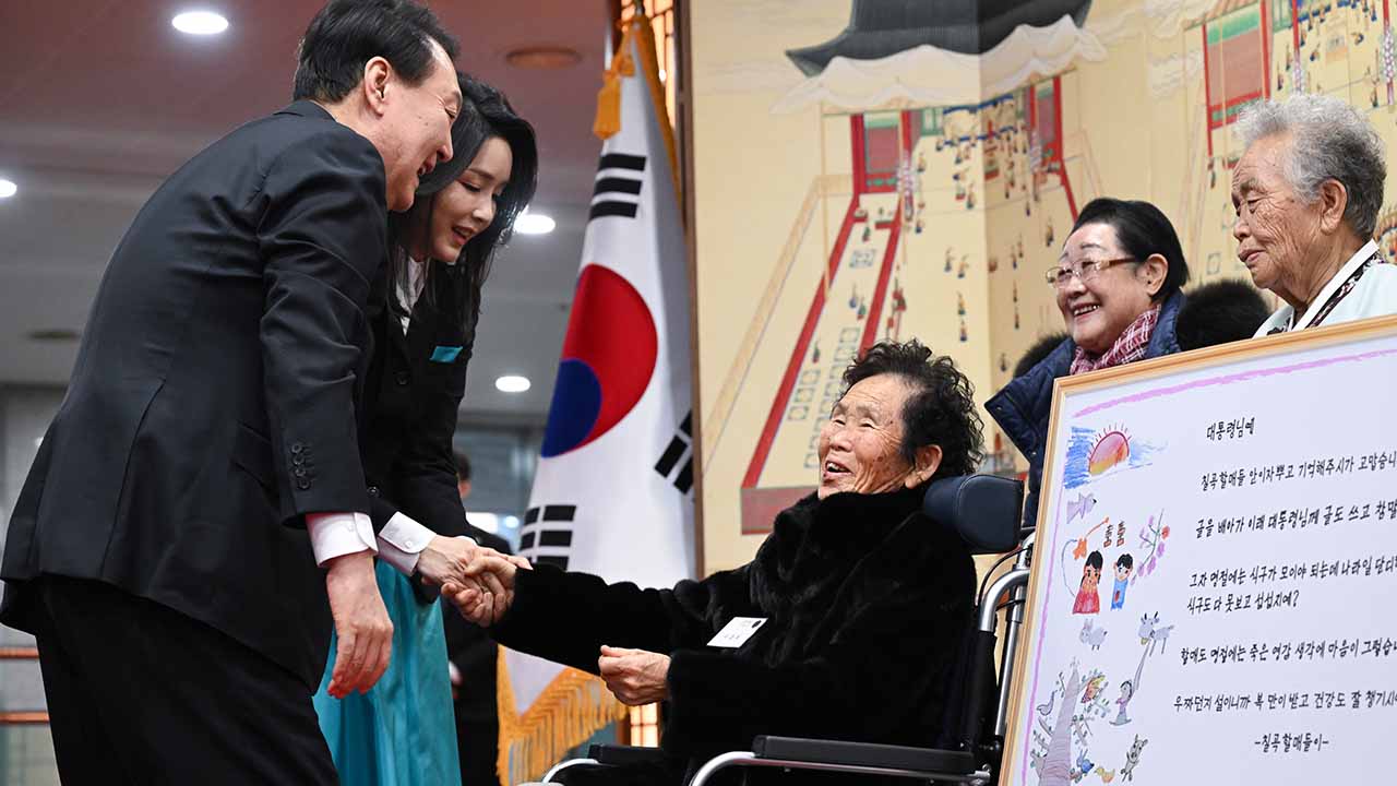 '칠곡할매글꼴'의 주인공인 경북 칠곡 할머니 5명이 12일 오후 서울 용산 대통령실을 방문해 대통령 부부를 만났습니다. 대통령실을 찾은 추유을(89)·이원순(86)·이종희(81)·권안자(79)·김영분(77) 할머니는 대통령 부부와 한글을 학습한 과정과 작품에 대해 자유롭게 대화를 나눴습니다. 할머니들은 윤 대통령에게 직접 재...