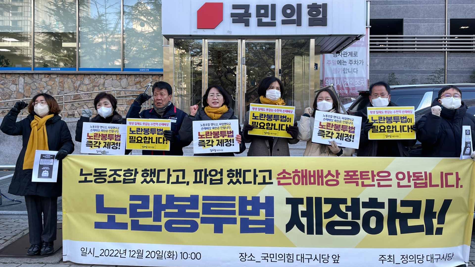 정의당 대구시당은 12월 20일 국민의힘 대구시당 앞에서 기자회견을 열고 노조 파업과 관련해 기업의 손해배상 청구를 제한하는 '노란봉투법' 제정을 촉구했습니다.정의당은 "노동조합을 하거나 파업했다고 천문학적인 수백억 원에 이르는 손해 배상 청구 소송을 노동자들에게 하는 일은 더 이상 안 된다"며 "여야는 7년을 ...