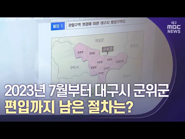 경북 군위군이 2023년 7월 대구시로 편입됨에 따라 대구시는 9번째 기초자치단체가 될 군위군을 맞이하기 위해 '군위군 편입 실무추진단'을 꾸리기로 하고 도시계획, 치안, 교육 등 달라지는 체계에 맞춰 후속 조치 마련에 들어갔어요.김종한 대구시 행정부시장, "실무추진단을 만들고, 향후에는 군위군하고 경상북도하고 ...
