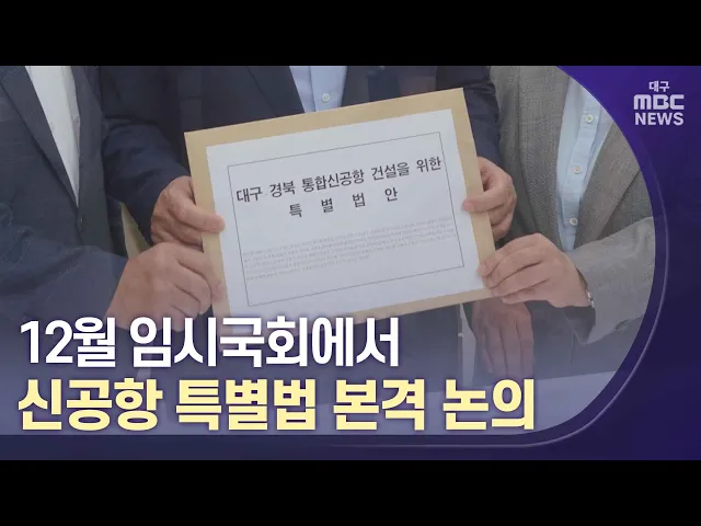 ◀앵커▶경북 군위군을 대구시로 편입하는 법률안이 국회를 통과하면서 이제 관심은 '대구·경북 통합 신공항 특별법'으로 쏠리고 있습니다.여·야의 예산 전쟁 등으로 파행된 정기 국회가 12월 9일 끝나면서 오는 12일부터 시작되는 임시국회에서 특별법 처리가 본격 논의될 것으로 보입니다.지역 정치권은 특별법 연내 통과를...