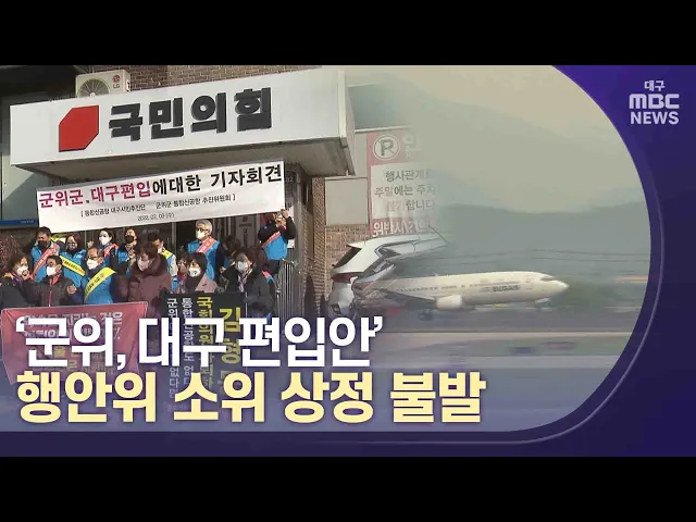 ◀앵커▶대구·경북 통합 신공항 추진의 핵심 동력이라 할 수 있는 군위군 대구 편입 추진이 차질을 빚고 있습니다.관련 법률안의 9월 국회 통과가 사실상 물 건너간 건데요. 국회 행정안전위원회 법안심사소위에 안건으로 상정조차 되지 않았습니다.경북 지역 국회의원들의 비협조 때문인데, 비판의 목소리가 커지고 있습니다...