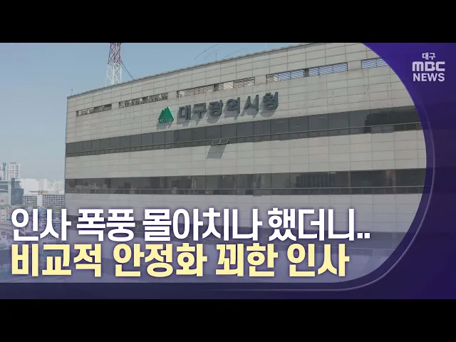 ◀앵커▶대구시가 대규모 조직 개편을 토대로 첫 정기 인사를 했습니다. 홍준표 대구시장이 고강도의 시정 개혁을 강조하면서 파격적인 인사 폭풍이 몰아칠 것으로 예측됐는데요,뚜껑을 열어보니 깜깜이 인사라는 불만은 가득했지만, 비교적 조직의 안정화를 추구한 인사가 단행됐다는 평가입니다. 권윤수 기자가 보도합니다....