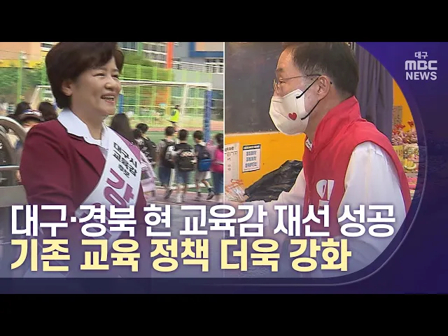 ◀앵커▶교육감 선거에서도 대구와 경북은 보수색 강한 현 교육감의 재선으로 마무리됐습니다.유권자들은 변화보다 안정을 선택하면서 학력 향상을 기본으로 한 기존의 교육 정책은 더욱 강화될 것으로 보입니다.조재한 기자가 보도합니다.◀기자▶대구교육감 선거에서 강은희 후보는 상대 후보가 없어 무투표 당선까지 거론됐...