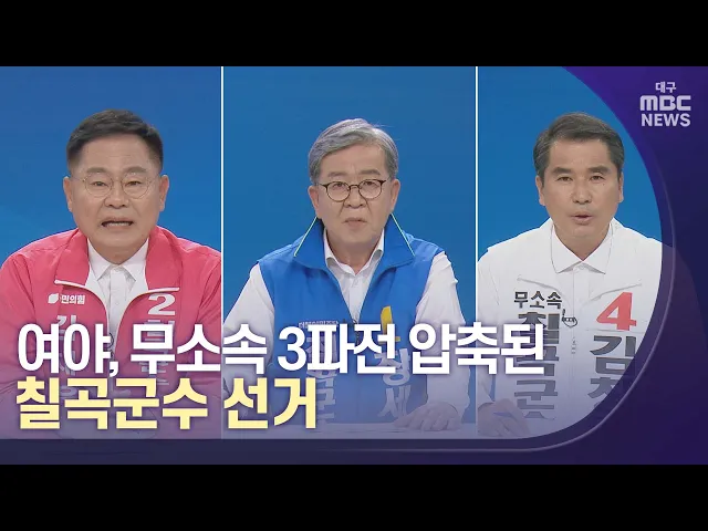 ◀앵커▶여야, 무소속 후보까지 모두 3명이 경쟁을 벌이는 칠곡군수 선거는 일주일 앞으로 다가온 6·1지방선거에서 격전지로 분류되는 곳입니다. 대구문화방송은 5월 25일 칠곡군수 후보자 토론회를 개최했는데요,제가 연설회 내용을 정리했습니다.◀기자▶칠곡군수 후보자 토론회는 더불어민주당 장세호, 국민의힘 김재욱, 여...