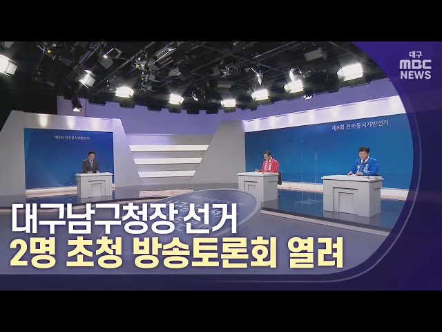 ◀앵커▶5월 20일 대구문화방송 스튜디오에서는 이번 6.1 지방선거에 출마한 대구 남구청장 후보자 토론회가 열렸습니다. 여당과 야당 두 명의 후보가 맞대결을 펼쳤는데, 두 후보는 미군부대 이전 터 개발을 비롯해 낙후된 지역 개발, 인구 유입 정책 등에 대한 다양한 의견을 제시하며 자신이 적임자라며 지지를 호소했습니...