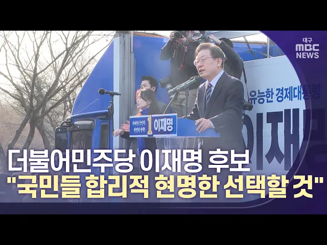 ◀앵커▶대통령 선거 이틀 전인 3월 7일, 더불어민주당 이재명 후보가 대구를 찾아 지지를 호소했습니다. 이 후보는 대구시민들에게 "고향이라서 특별하게 챙기겠다," "자신이 문제 해결 능력이 있다"라고 강조했습니다.안갯속 선거판이지만 국민들을 믿기 때문에 0그 결과를 낙관한다고 자신감을 보였습니다.김철우 기잡니...