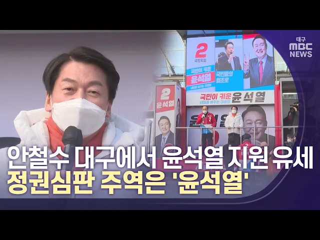 ◀앵커▶ 윤석열 국민의힘 대선후보와 단일화하고 대선후보에서 사퇴한 안철수 국민의당 대표가 오늘 보수의 성지로 불리는 대구를 찾아 윤석열 후보 지원 유세를 펼쳤습니다.안철수 대표는 문재인 정권이 위기를 자초했다고 강하게 비판하며 정권 교체를 위해 윤석열 후보를 지지해 줄 것을 호소했습니다.이상원 기자가 보도...
