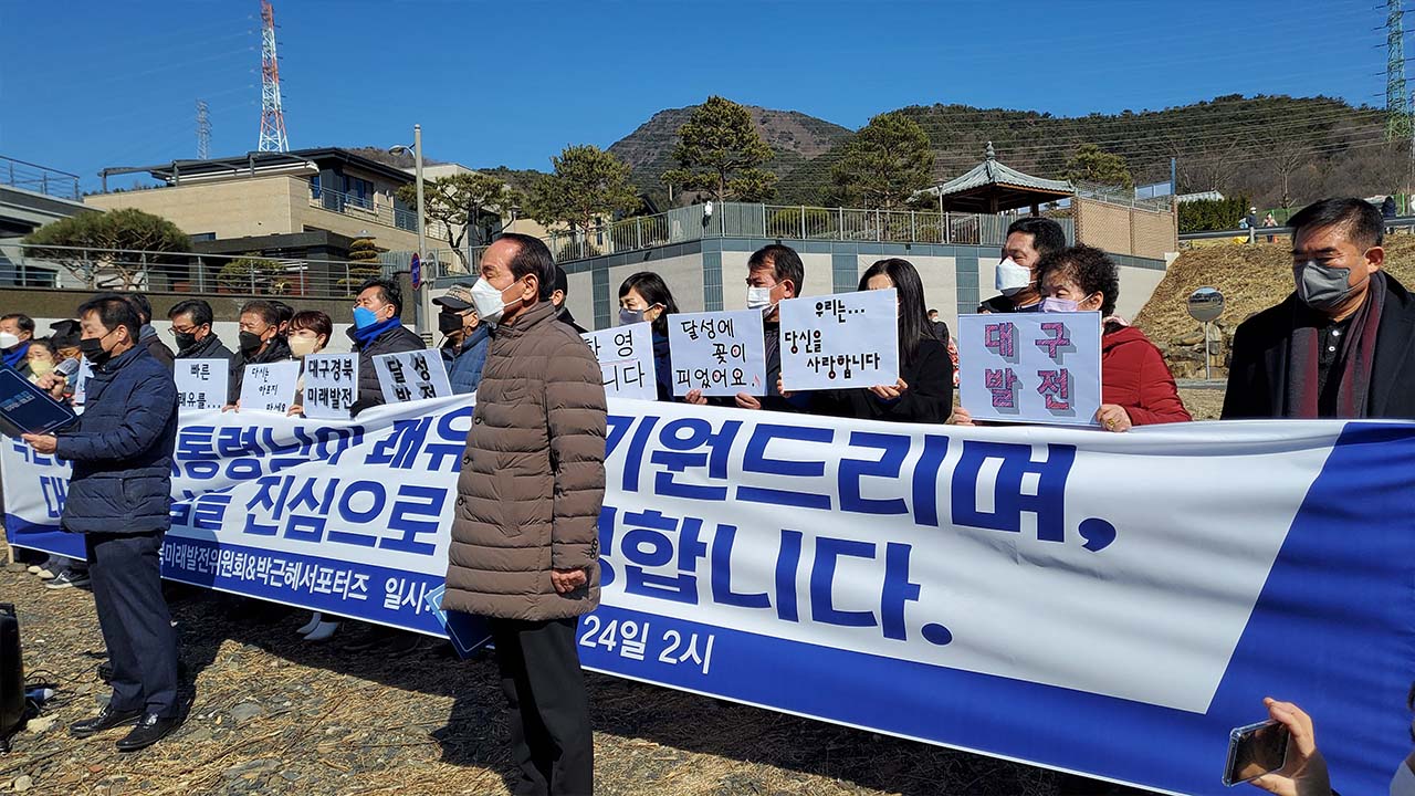 이재명 후보 선대위 소속 더불어민주당 대구·경북 미래발전위원회는 달성군 유가읍 박근혜 전 대통령 사저 앞에서 박 전 대통령을 환영하고 쾌차를 기원하는 행사를 열었습니다.박창달 대구·경북 선대위원장을 비롯해 중도보수인사 백여 명은 박 전 대통령 환영식을 열고 "박 전 대통령의 국가 우선주의를 본받아 진영논리...