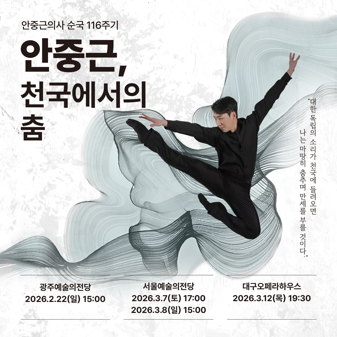 안중근 의사의 숭고한 희생 정신과 평화 사상을 발레로 풀어낸 기획 공연 '안중근, 천국에서의 춤'이 대구 무대에 오릅니다.광주와 서울 예술의전당 공연을 성황리에 마친 M발레단의 이번 전국 순회 공연은 오는 3월 12일(목) 오후 7시 30분, 대구오페라하우스에서 막이 오릅니다.안중근 의사 순국 116주년을 기념하여 제작...