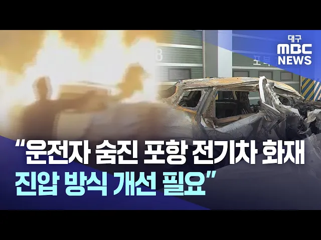 ◀앵커▶최근 포항에선 전기차 택시가 건물에 충돌한 후 불길에 휩싸여 운전자가 숨지는 안타까운 사건이 있었습니다.소방서는 전기자동차 화재 매뉴얼에 따라 화재를 진화했지만 불을 끄는 데만 2시간가량 걸렸습니다.현장에선 전기차 화재 진압 방식을 개선해야 한다는 지적이 나오고 있습니다.이규설 기잡니다. ◀기자▶9월 ...