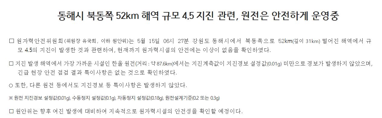 사진 제공 원자력안전위원회원자력안전위원회는 5월 15일 오전 6시 27분 동해시 북동쪽 52km 해역에서 발생한 규모 4.5 지진과 관련해 국내 원전 안전에는 이상이 없다고 밝혔습니다.원안위는 진앙지와 92km 떨어져 진앙지와 가장 가까운 한울원전의 지진 계측값은 지진경보 설정값인 0.01g 미만으로 측정됐고, 다른 원전...