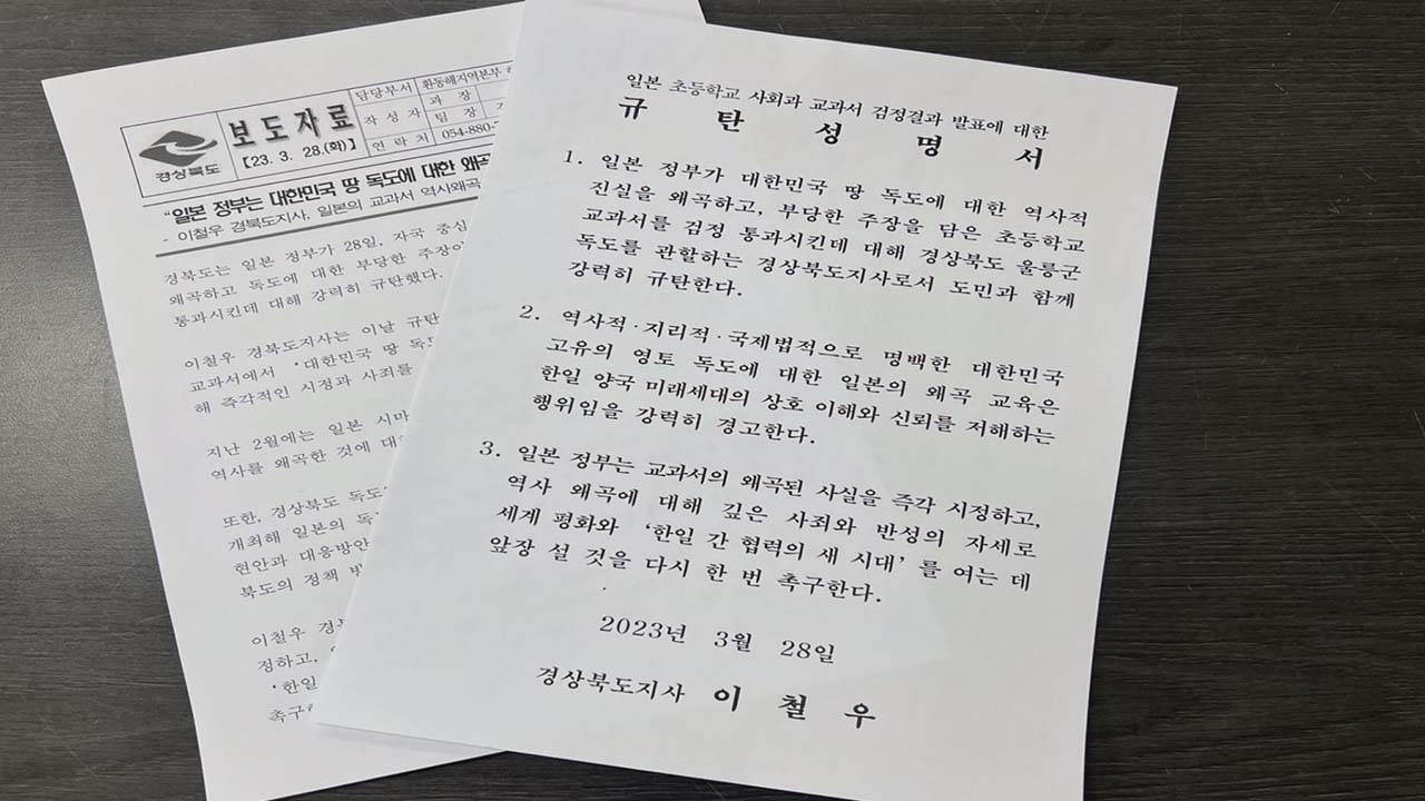 경상북도, 경북도의회, 경북교육청은 성명을 내고 일본 정부의 역사 왜곡 교육을 규탄했습니다.경상북도와 경상북도의회는 일본 정부가 대한민국 땅인 독도에 대한 역사적 진실을 왜곡하고 부당한 주장을 담은 초등학교 교과서를 검정 통과시킨 데 대해 강력히 규탄했습니다.이와 함께 역사 왜곡에 대한 깊은 사죄와 반성을...