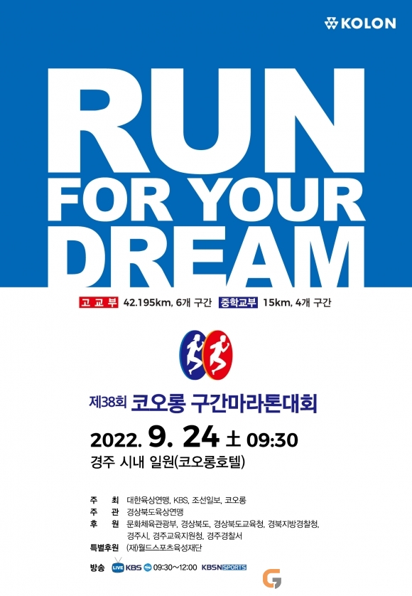 제38회 코오롱 구간 마라톤 대회가 9월 24일 경주 일원에서 3년 만에 개최됩니다.이번 대회에는 중·고등학교 28개 팀, 2백여 명의 선수가 참여해 고등학교 42.195킬로미터, 중학교는 15킬로미터를 릴레이 방식으로 진행합니다.대회가 열리는 구간에는 9일 오전 9시부터 오후 1시까지 전면 또는 부분적으로 교통통제가 이뤄...