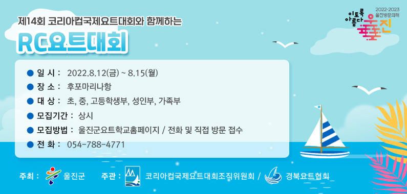 울진군은 8월 12부터 16일까지 동해 해상 일원과 독도를 돌아오는 제14회 코리아컵 국제요트대회를 개최합니다.울진군이 주최하고 코리아컵 국제요트대회 조직위원회, 경북요트협회가 주관하는 이번 대회는 국내외 500여 명의 선수단이 참가합니다.특히 이번 대회는 후포마리나 준공식과도 함께 개최되고, 요트 체험, 프리...
