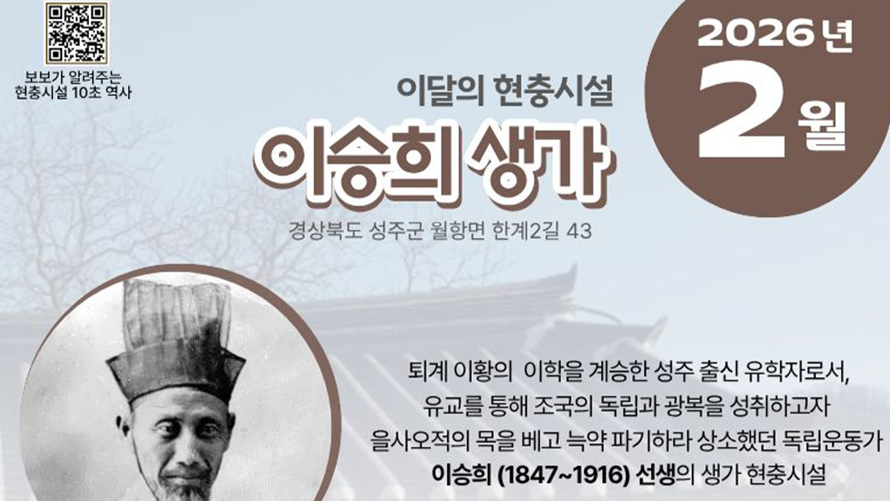 대구지방보훈청이 경북 성주군에 있는 이승희 생가를 이달의 현충 시설로 선정했습니다.성주 출신의 성리학자 이승희 선생은 1907년 지역에서 국채보상운동을 이끌었고, 헤이그 만국평화회의와 세계 각국 정부에 편지를 보내는 등 국권 회복을 위해 노력했습니다.또 1908년 러시아로 망명한 뒤 만주에 한인 독립운동 기지인...