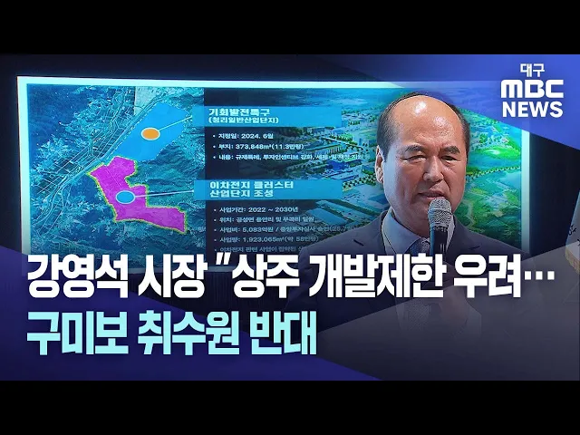 ◀앵커▶강영석 경북 상주시장이 최근 지역 현안에 대해 직접 설명하는 시민 보고회를 열었습니다.대구 취수원 새 이전지로 구미보 상류가 거론되고 있지만, 상주가 개발제한 구역으로 묶일 수 있는 만큼 절대 용인하지 않겠다고 밝혔습니다.상주시가 1백억 원의 투자 장려금을 지급한 이차전지 음극재 공장은 8월부터 미국 ...