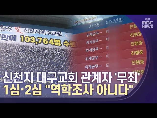 ◀앵커▶지난 2020년 2월과 3월 대구는 신천지 대구교회를 중심으로 코로나 19 집단 감염이 발생했습니다.대구시는 교인 명단 제출을 요구했지만, 교회 측이 명단 일부를 누락하고 제출해 감염병예방법 위반 혐의로 재판을 받았는데요.지난해(2021년) 1심 재판부가 이들에게 무죄를 선고한 데 이어 오늘(1월 19일) 2심 재판부...
