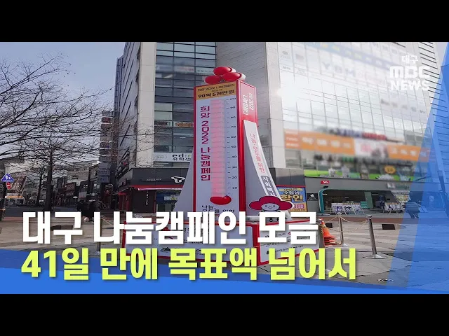 '희망 2022 나눔 캠페인' 41일 만에 대구 목표액을 달성했습니다.대구시에 따르면 2021년 12월 1일부터 2022년 1월 10일까지 41일 만에 나눔 캠페인으로 91억 6천만 원을 모금해 목표액 90억 5천만 원을 넘었습니다.지난해 같은 기간 86억 7천여만 원보다 4억 9천만 원 더 많습니다. 법인 기부액이 56억여 원으로 61%이고 ...