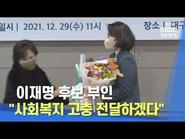 이재명 후보의 부인 김혜경씨가 오늘 대구를 찾아 사회복지사들의 고충을 들으면서 이재명 후보를 대신해 대구경북의 민심 얻기에 나섰습니다.김씨는 오늘 대구사회복지유권자연맹을 방문해 사회복지사들의 실태와 고민, 개선사항 등을 듣고 건의 사항들을 이재명 후보에게 전달해 공약에 반영될 수 있도록 노력하겠다고 밝...