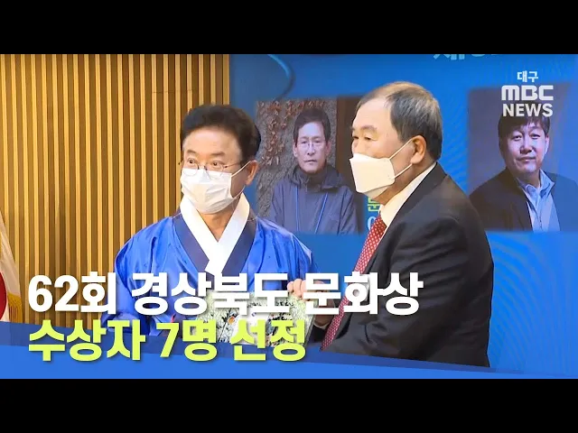 경상북도가 62회 경상북도 문화상 수상자 7명을 선정해 상을 줬습니다.문학 부문에 경북문인협회 이용섭, 언론 부문 김형규 대구일보 부국장, 문화 부문에 황명륜 한국예총 김천지부 고문이 선정됐습니다.학술 부문에 권진호 한국국학진흥원 국학기반본부장, 공연예술 부문에 이연숙 한국국악협회 칠곡지부장, 시각예술 부...