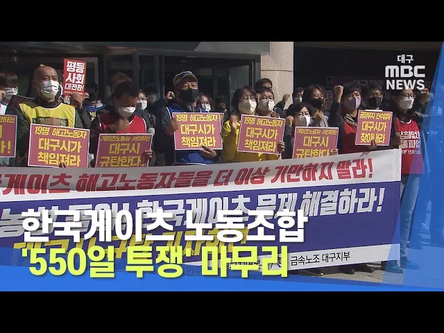 한국게이츠 노동조합이 오늘 대구시청 앞 천막 농성을 끝내고 550일간의 투쟁을 마무리하기로 했습니다.이들은 "게이츠의 폐업 통보를 받은 뒤 청와대와 국회, 대구시청과 대성산업 등 일 년 반 동안 전국을 다니면서 호소한 끝에야 게이츠 본사의 교섭 요청이 들어와 서로의 요구를 절충할 수 있었다"고 밝혔습니다"여전히...