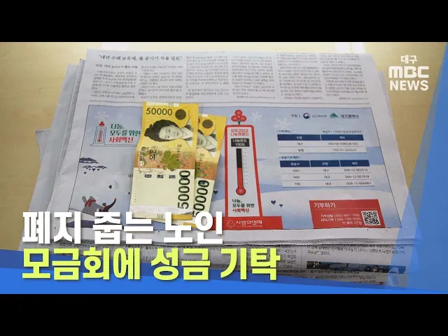 폐지를 줍는 노인이 대구 사회복지공동모금회에 성금을 기탁해 따뜻함을 전했습니다.대구 공동모금회에 따르면 평소 폐지를 주워 생활하고 있는 75살 김모 할머니가 최근 모금회를 찾아 성금 10만 원을 어려운 이웃을 위해 써 달라며 전달했습니다.김 할머니는 폐지를 주운 돈으로 경로당에서 간식을 나눠먹곤 했지만 최근 ...